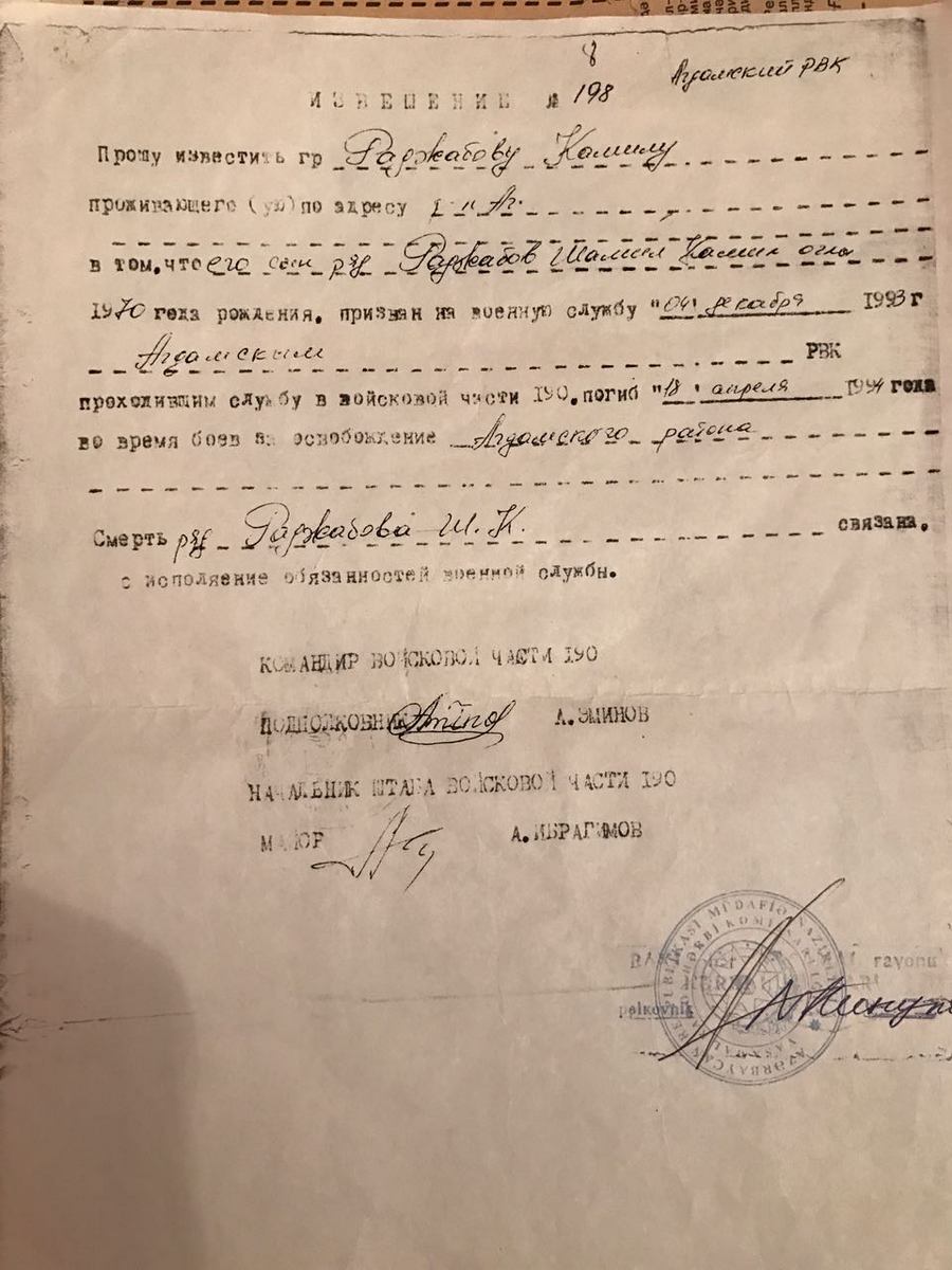 After the occupation of Aghdam by Armenian forces, Shamil discontinued his studies and voluntarily joined the front line.
