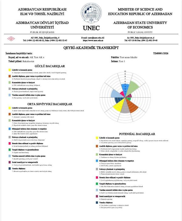 Исходя из этой потребности, подготовленный UNEC «Неакадемический транскрипт» официально подтвердит неакадемические навыки, приобретенные выпускниками за время обучения в университете. Этап тестирования проекта начнётся в апреле, а официальные экзамены для получения неакадемического транскрипта начнутся в мае.